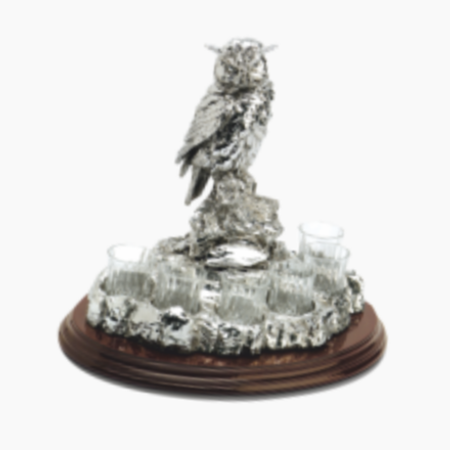 Poklon set – 6 kristalnih čašica za jaka alkoholna pića na drvenom postolju s figurom sove ušare, u luksuznoj poklon kutiji talijanskog proizvođača Chinelli, savršen je za stvaranje svečane atmosfere za stolom.